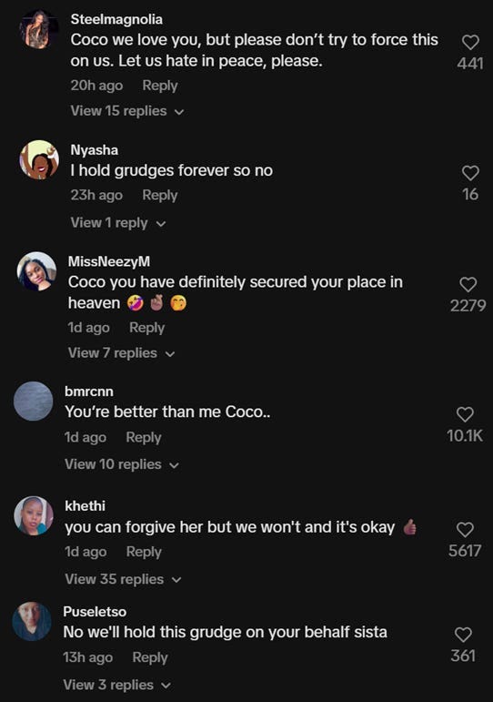But think about how insane this is—imagine if one of the readers of my substack decided to weigh in on an apology I made to a friend for forgetting to pick him up at the airport as “not good enough” even if both of us had felt the apology was sufficient. We would say that person should mind their own business.