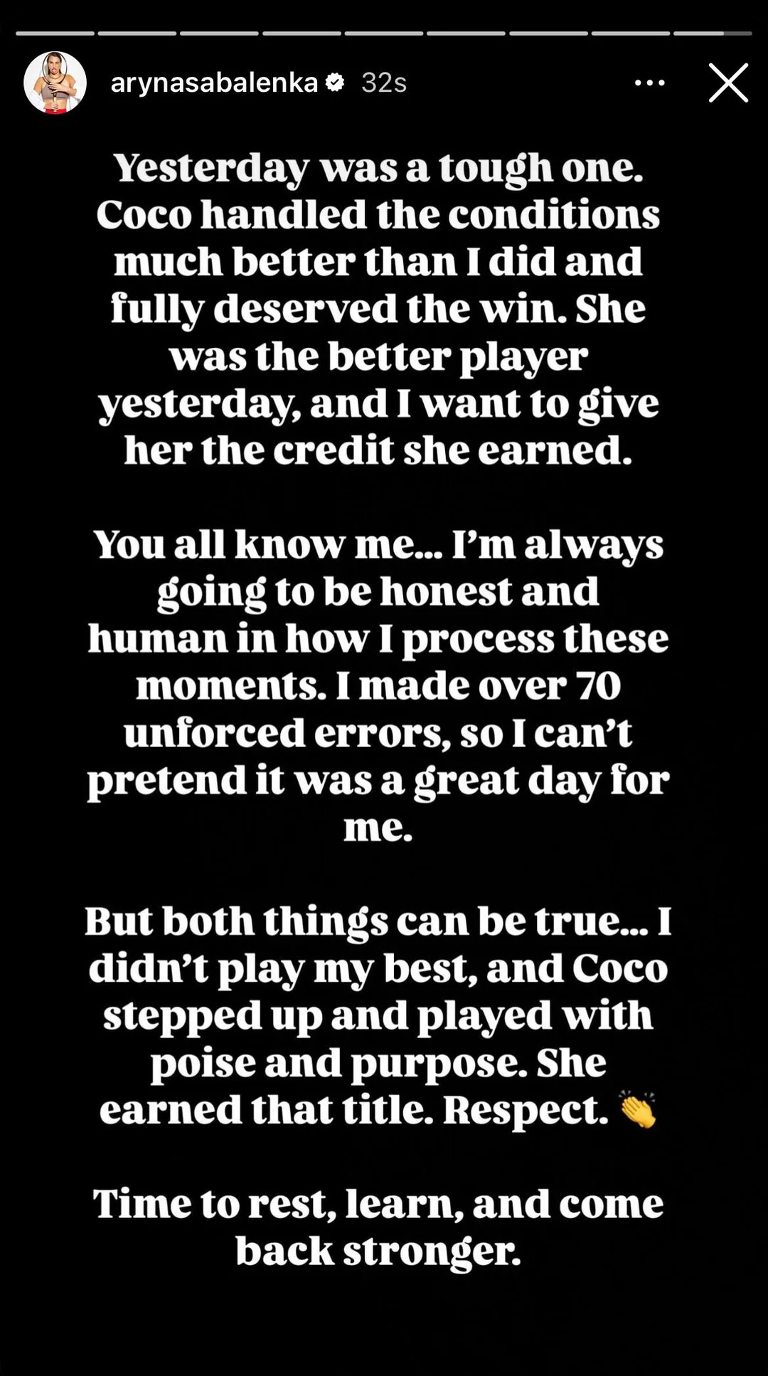 That grace came into play when Sabalenka started walking back her statements. It started the next day with an instagram story: